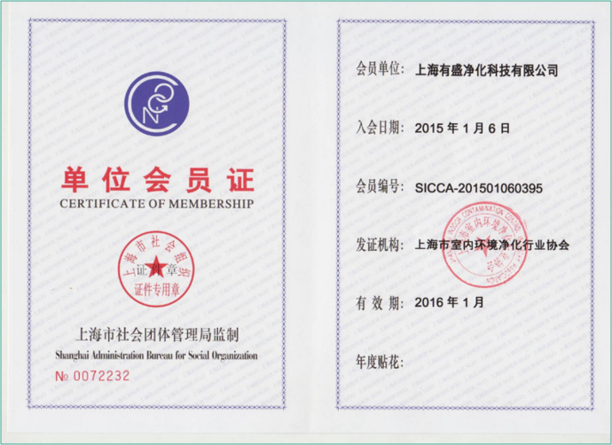 上海有盛凈化室內環(huán)境凈化行業(yè)協會會員證書